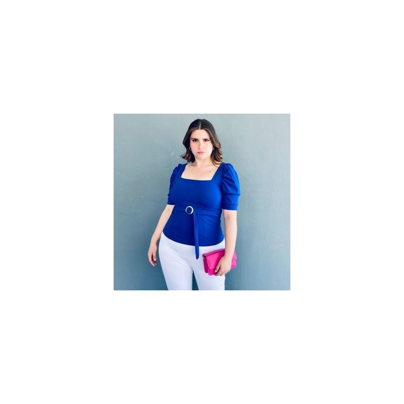 Esta blusa es confeccionada en una tela strech que se ajusta perfectamente al cuerpo. Cuenta con un elegante escote cuadrado que resalta la clavícula y una manga abullonada que le da un toque romántico. El detalle más destacado es un listón de la misma tela en la cintura que se ajusta con una hebilla redonda, creando una silueta elegante y favorecedora. El fit viene a la medida, por lo que se recomienda solicitarlo a su talla; La modelo es talla 36 y mide 1.78. Corte: Curvy, Plus Size, Talla Extra. Composición: 90% Poliéster, 10% spandex.