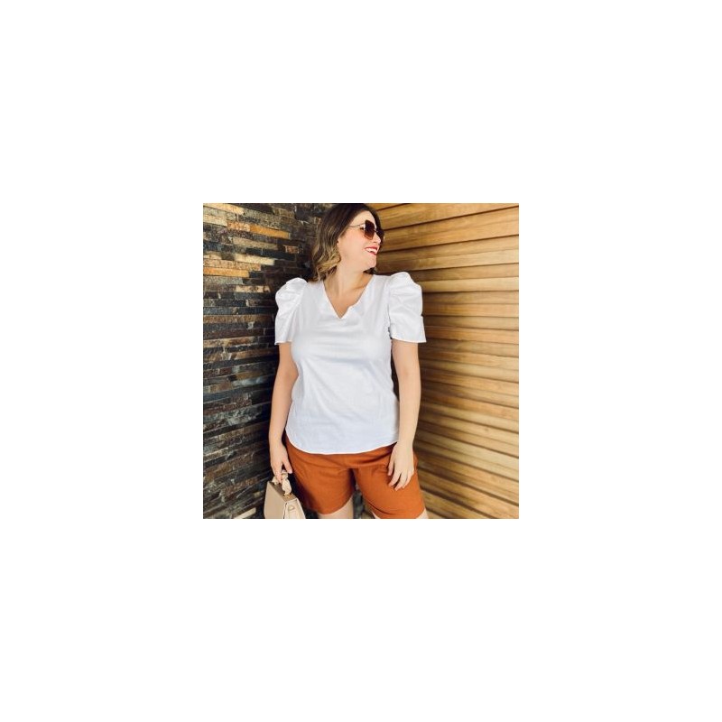 Blusa de popelina con strech; corte recto, escote en V y manga farol, que le brindan un toque sofisticado. El modelo está confeccionado en tela fresca y muy de temporada, ideal para cualquier evento. La modelo usa talla 38 y mide 1.78. Corte: Curvy, Plus Size, Talla Extra. Composición: 82% poliéster, 18% spandex.