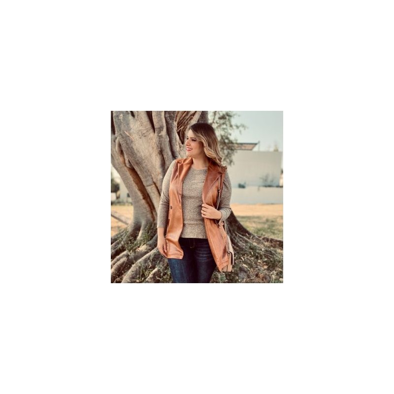 Precioso chaleco en talla extra, con botonadura al frente y detalle de bolsillos simulados, que le dan un toque femenino. El modelo está confeccionado en tela tipo gamuza con ligero brillo, el cual puedes combinar con looks casuales o semi-formales. La modelo usa talla talla 36 y mide 1.78 (Composición: 100% Poliéster).