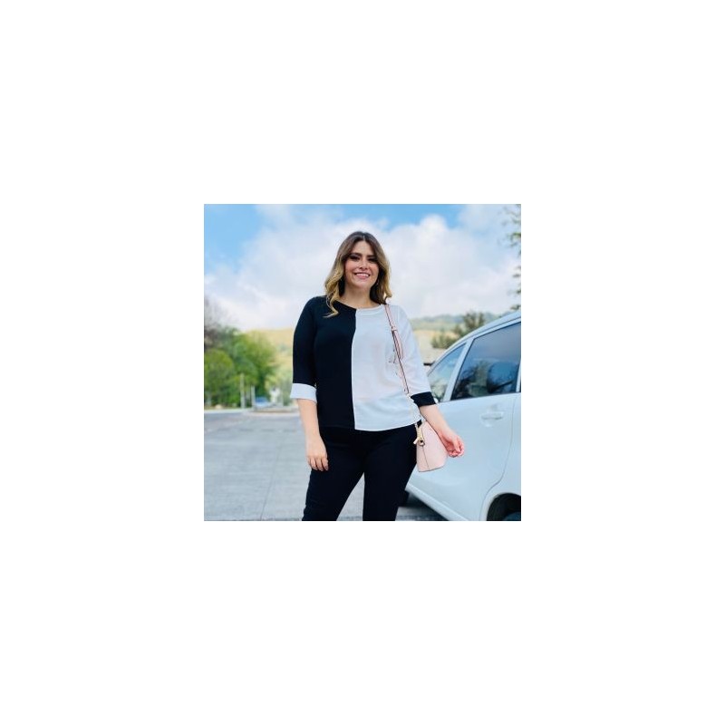 Hermosa blusa amplia con el diseño mas deseado de esta temporada: en combinacion de 2 colores! Modelo muy basico y facil de combinar con cualquier outfit. Ideal para uso diario o salidas de dia. La modelo usa talla 36. 50% Algodon y 50% Poliester.