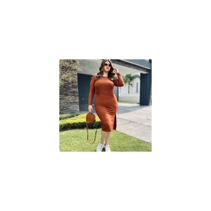 Vestido midi de manga larga, escote redondo y pequeña abertura inferior en pierna, que le da un toque femenino. Además cuenta también con un listón de la misma tela que simula un fajo, para complementar el look. Un modelo súper cómodo, adecuado para un outfit diario. La modelo usa talla 38 y mide 1.78. Corte: Curvy, Plus Size, Talla Extra. Composición: 90% poliéster, 10% spandex.