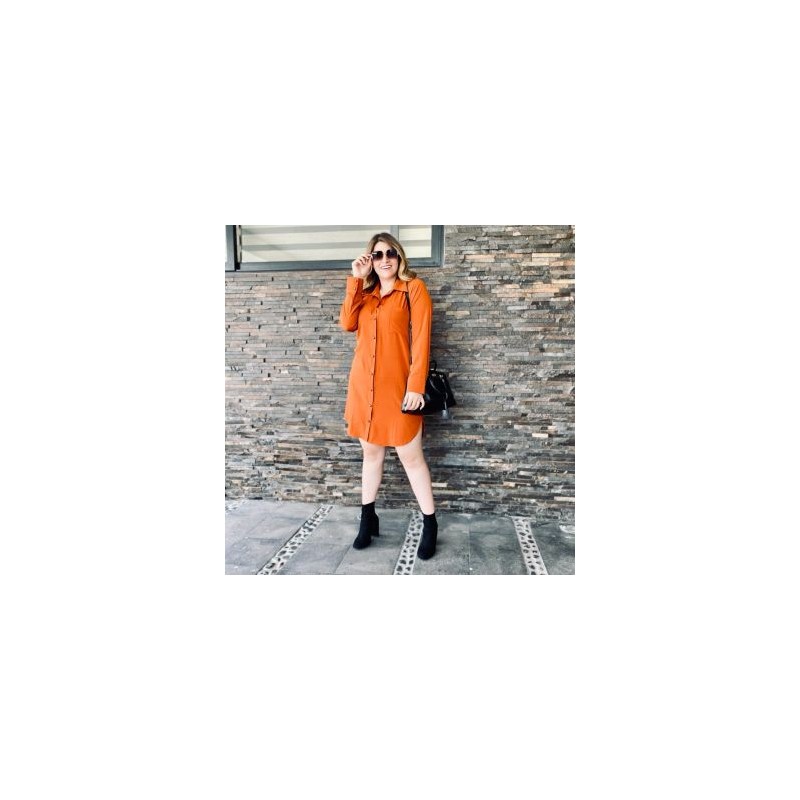 Hermoso vestido tipo camisa en MEGA TENDENCIA! Tela con textura lineal ligeramente percibido, que le da un toque mas fino a la prenda. Botones tono cobre y tela sin strech, pero viene a su talla. No se recomienda para chicas con busto muy grande (arriba de copa D) para evitar que se abran los botones del busto. La modelo usa talla 38 y mide 1.78. Composición 100% Poliester.