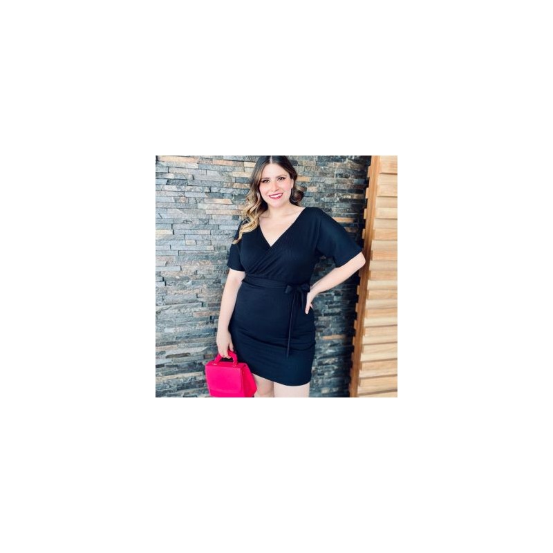 Vestido corto con strech, manga corta abierta y escote cruzado en V que lo hace lucir sexy. Cuenta también con un listón de la misma tela que forma un moño en la cintura, el cual complementa el diseño dándole el toque femenino. El modelo ideal para robar miradas en cualquier evento. La modelo es talla 38 y mide 1.78. Corte: Curvy, Plus Size, Talla Extra. Composición: 82% poliéster, 18% spandex.