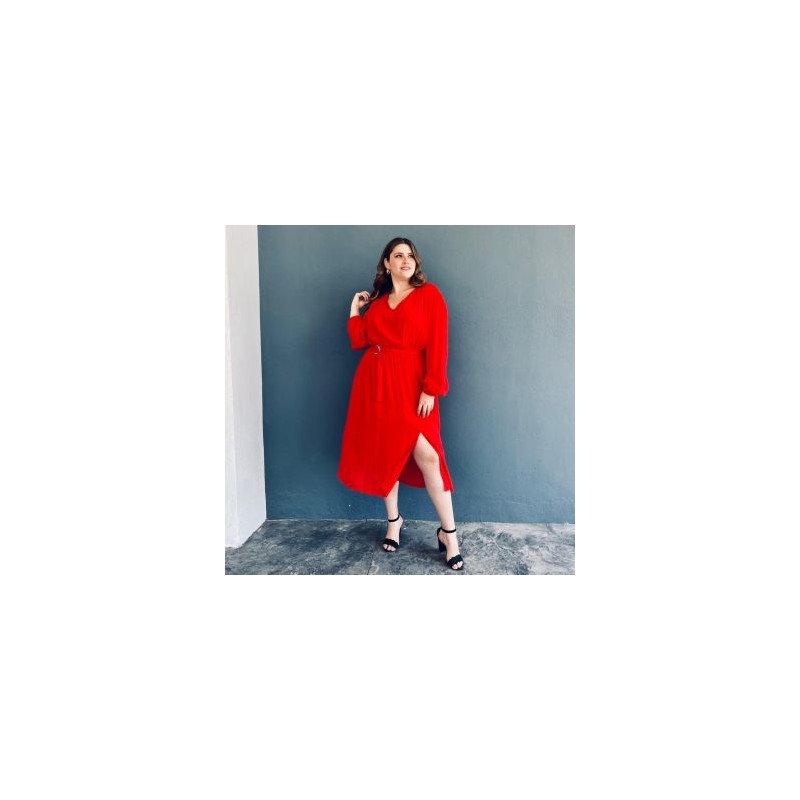 Vestido midi sin strech, abertura inferior, escote V y manga larga con elástico en puño. Incluye también un fajo del la misma tela con aro de metal, que nos ayuda a resaltar la figura. El modelo está cofeccionado en tela fresca e incluye fondo para evitar transparencias. Sin duda un estilo formal y bastante femenino, ideal para un outfit diario. La modelo es talla 38 y mide 1.78. Corte: Curvy, Plus Size, Talla Extra. Composición: 18% poliéster, 82% spandex.