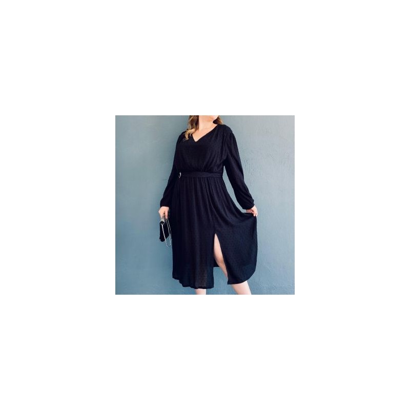 Vestido midi sin strech, abertura inferior, escote V y manga larga con elástico en puño. Incluye también un fajo del la misma tela con aro de metal, que nos ayuda a resaltar la figura. El modelo está cofeccionado en tela fresca e incluye fondo para evitar transparencias. Sin duda un estilo formal y bastante femenino, ideal para un outfit diario. La modelo es talla 38 y mide 1.78. Corte: Curvy, Plus Size, Talla Extra. Composición: 18% poliéster, 82% spandex.