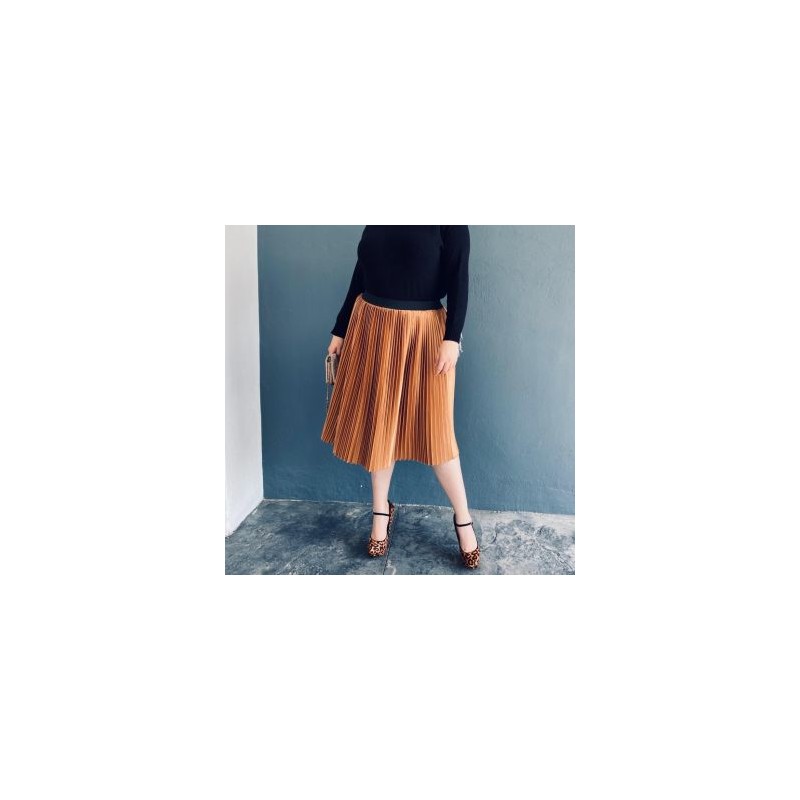 Falda midi, diseño plisado en corte A con resorte en cintura, para un mejor ajuste y comodidad. El modelo está confeccionado en tela de satín sin strech, la cual la posiciona dentro de los principales modelos a lucir en esta temporada! La modelo usa talla 38 y mide 1.78. Corte: Curvy, Plus Size, Tallas Extras. Composición: 82% poliéster, 18% spandex.