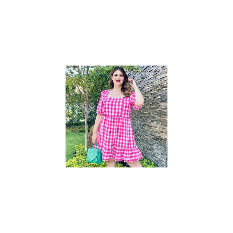Vestido sin strech de manga 3/4 con diseño bombacha, escote cuadrado y pinzas al frente que remarcan la silueta. Cuenta también con olán en la parte inferior el cual le da un toque favorecedor. La modelo es talla 38 y mide 1.78. Corte: Curvy, Plus Size, Talla Extra. Composición: 100% rayón.