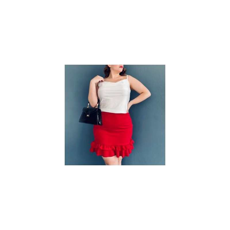 Falda corta con poco strech, diseño básico con detalle de olán en la parte inferior, que da un toque moderno. Pretina con elástico para mayor cómodidad. Un modelo elegante y facil de combinar. El modelo está confeccionado en tela fresca y súper cómoda, ideal para esta temporada. La modelo usa talla 38 y mide 1.78. Corte: Curvy, Plus Size, Talla Extra. Composición: 90% poliéster, 10% spandex.