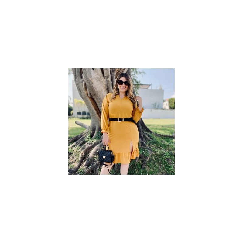 Precioso modelo de vestido de chiffon de manga larga y una coqueta apertura en la pierna. Tela con lijera estructura lineal, sin strech, pero viene a su talla con resorte en la cintura. Para enmarcar la silueta te sugerimos agregar a tu look un cinto de ante o de piel, La modelo usa talla 36 y mide 1.78. Composición: 100% Poliester